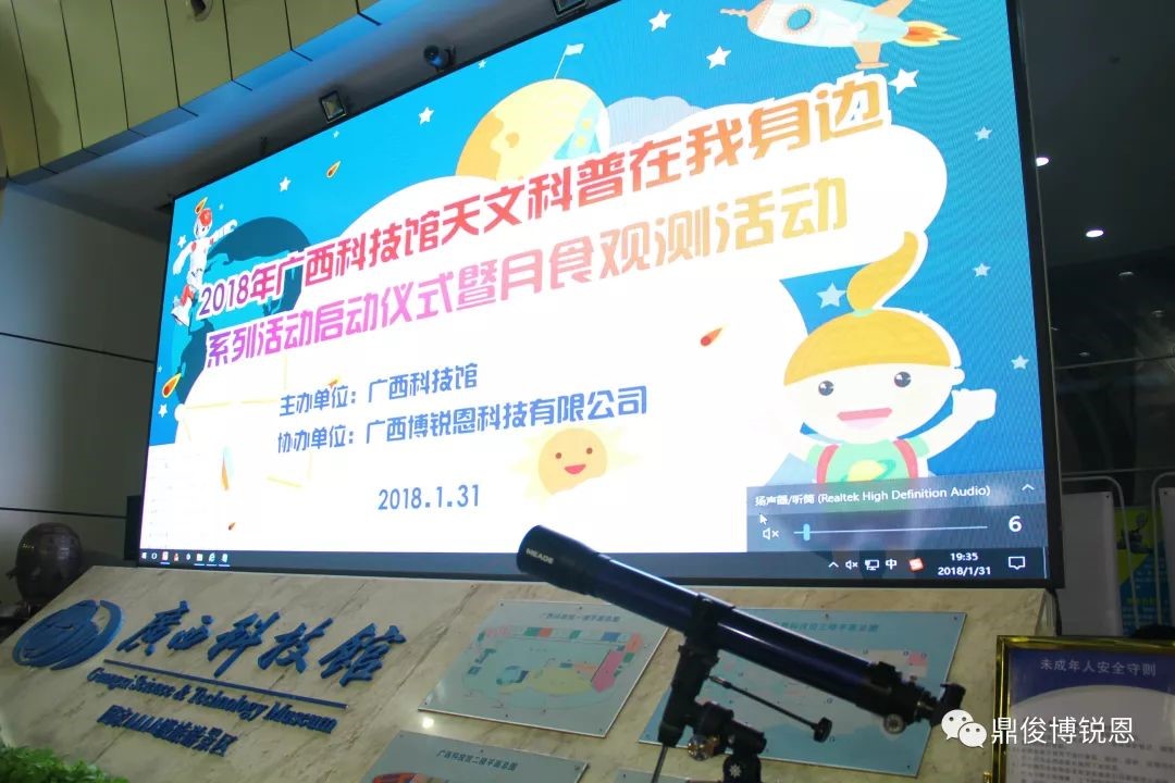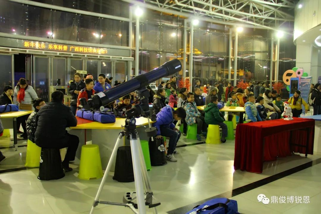 此次活动分室内和室外两个部分,室内开展科技《2018年月全食小知识》的科普讲座、机器人舞蹈表演、看天文球幕电影,室外部分为广西科技馆广场前现场摆放11台天文望远镜,同时广西博锐恩科技有限公司和科技馆里天文爱好志愿者小组工作人员为现场市民调科普、调试望远镜、讲解……